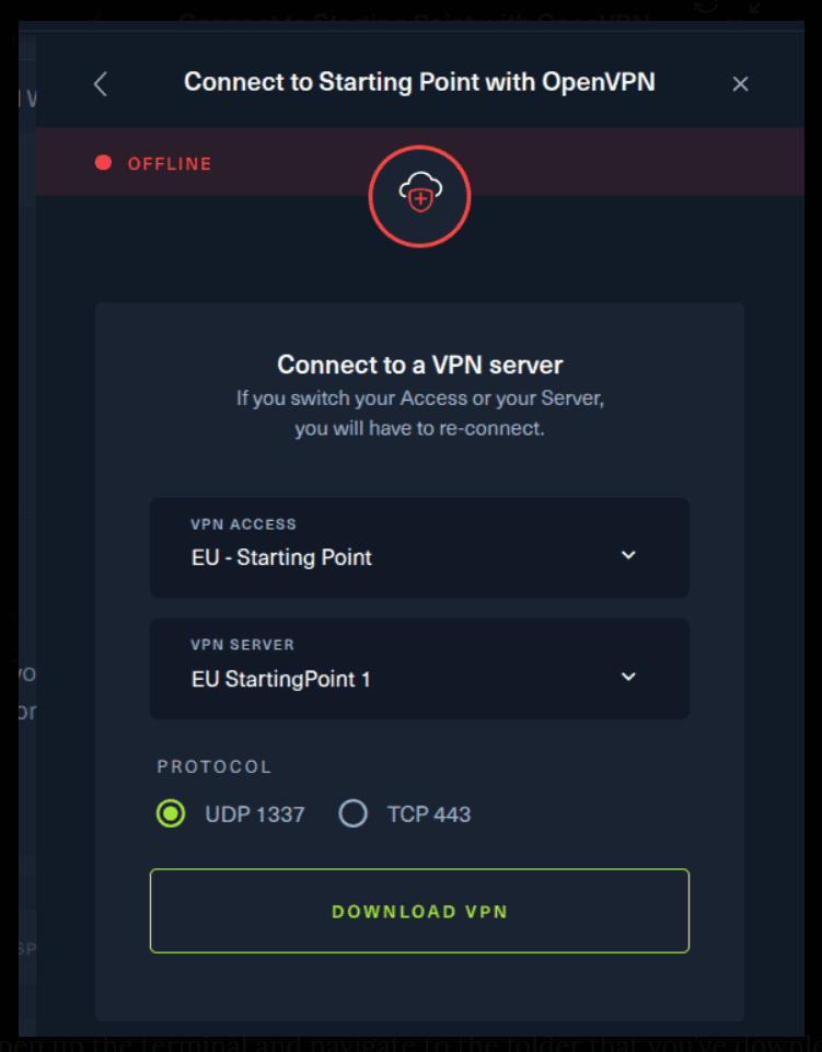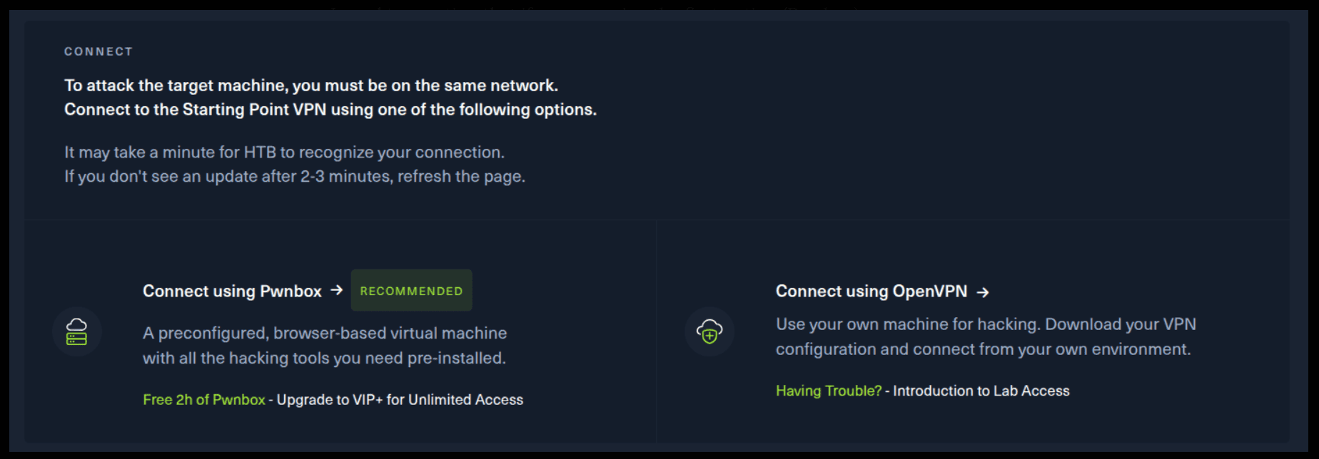 Remember to change the IP adress to your allocated one! :) There are 2 options available to connect to our machine. First using Pwnbox or secondly using OpenVPN.
