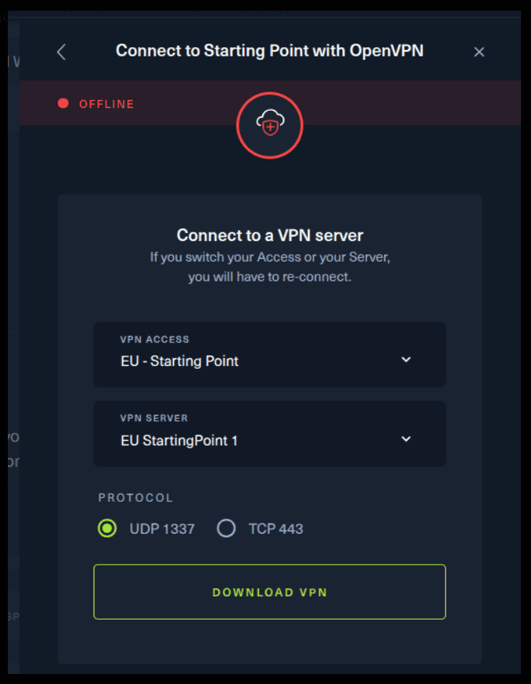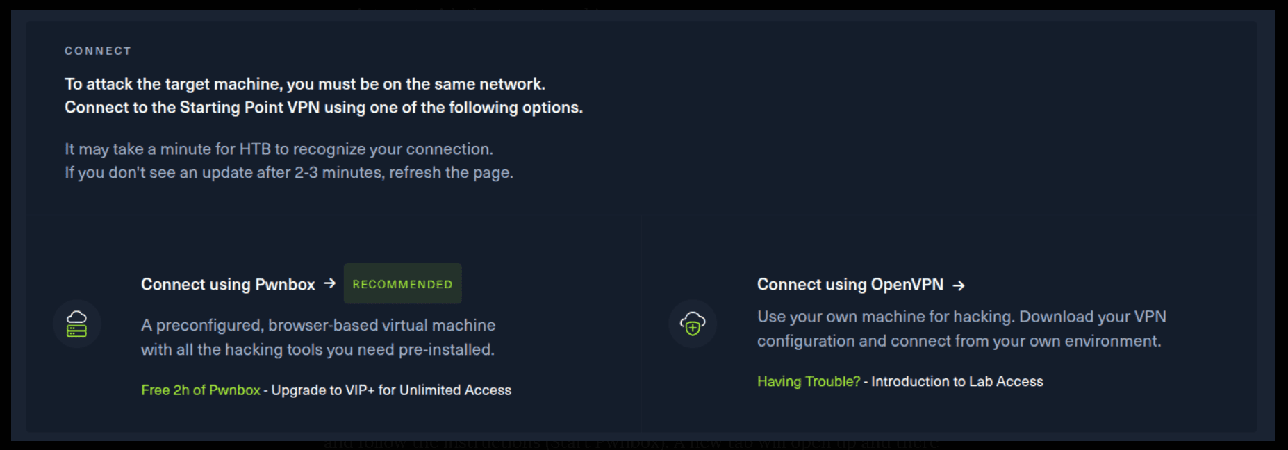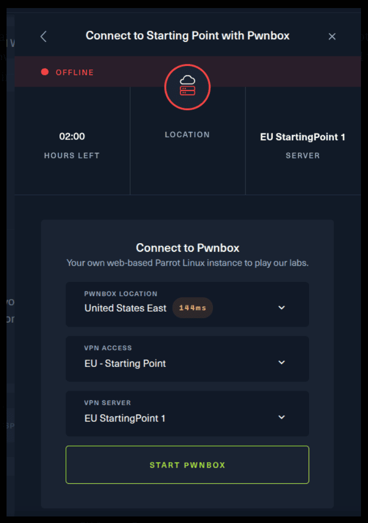 Remember to change the IP adress to your allocated one! :) There are 2 options available to connect to our machine. First using Pwnbox or secondly using OpenVPN.