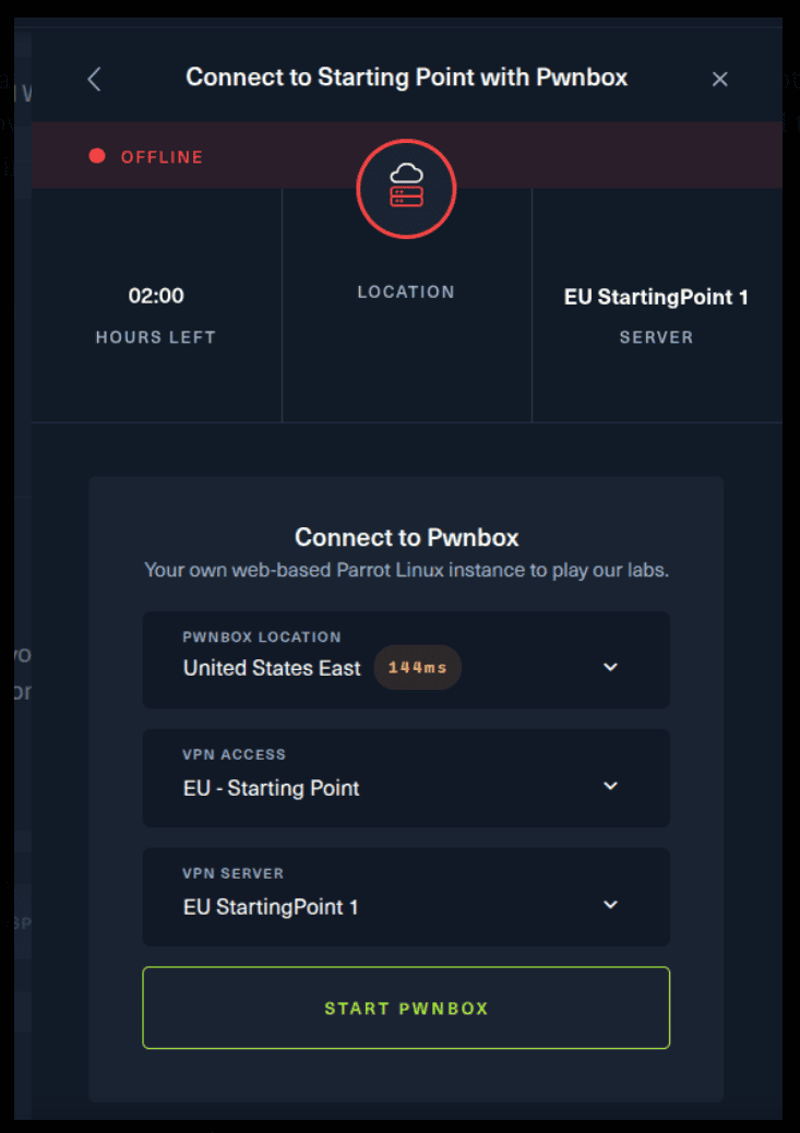I need to mention that if you are using the first option (Pwnbox) you can follow this guide, regardless if you are using Windows, Mac OS or Linux. This is the case, because a new tab will open in your web browser and there you can interact with the target machine. Now, if you are using Ubuntu-based distros, you can following this guide using the second option as well, but it will not work with a Windows OS for example.