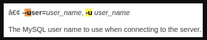 Nmap done: 1 IP address (1 host up) scanned in 185.36 secondsWhen using the MySQL command line client, what switch do we need to use in order to specify a login username?