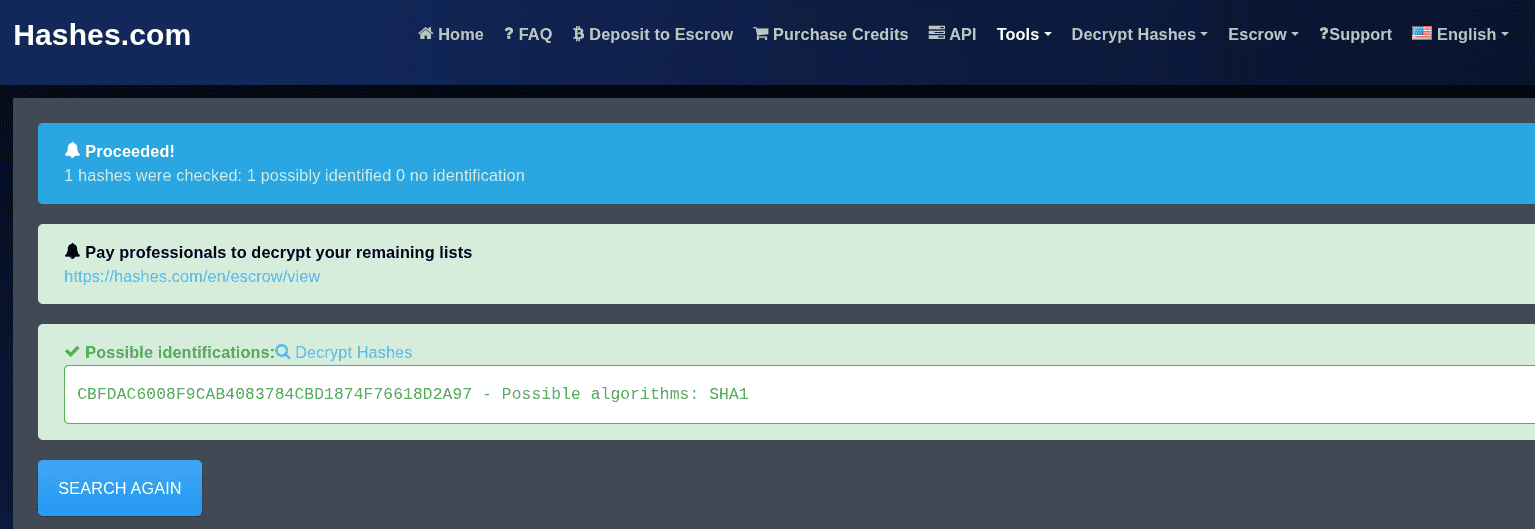 echo "CBFDAC6008F9CAB4083784CBD1874F76618D2A97" > crack2.hashWe follow the same approach as before, but the hash is changed from MD5 to SHA1. You can find the hash identifier by using this website.