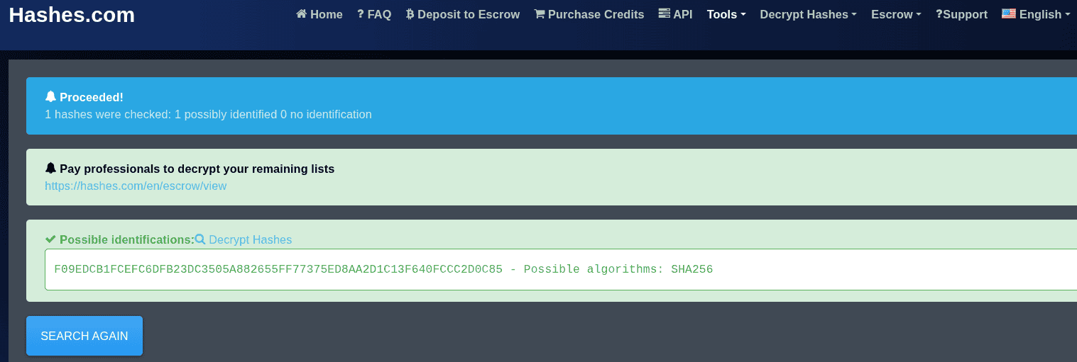 Hash: F09EDCB1FCEFC6DFB23DC3505A882655FF77375ED8AA2D1C13F640FCCC2D0C85Use the following website to find the hash identifier.